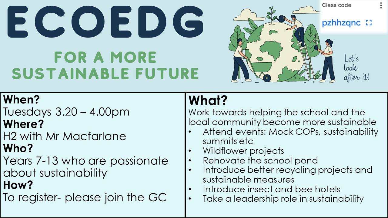 If your son or daughter is interested in joining these projects, encourage them to attend our sustainability group, which meets every Tuesday after school in H2. By joining, students will actively contribute to improving the school’s environment and gain opportunities to be involved in meaningful sustainability events and initiatives.