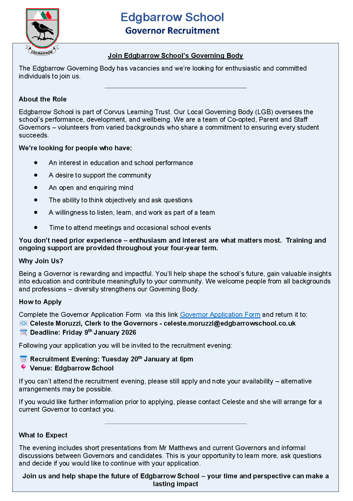 The Edgbarrow Local Governing Body comprises two parent governors, one staff governor, the Headteacher (ex officio), and sixteen co-opted governors. They are all volunteers who give their time and expertise free of charge to ensure that the school runs smoothly, within budget, and prioritises the needs and well-being of pupils and staff.